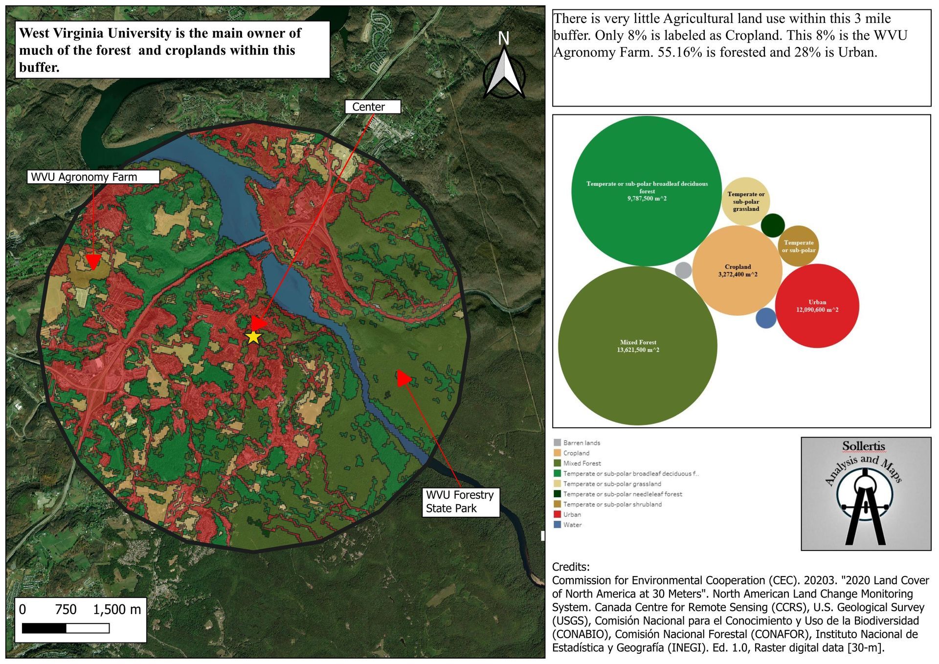 A product from a conversation with my father (raised honeybees his whole life), this takes 2023 land use data and clips baseed on a 3 mile buffer. It's mostly forested which means there are plenty for honeybees to forage but only when flowers bloom in the spring and early summer.
